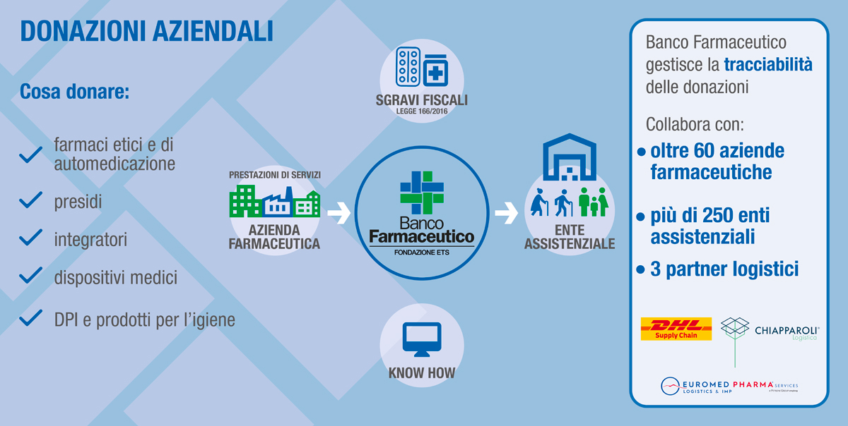 Banco Farmaceutico, attraverso il sistema delle Donazioni aziendali, avvicina il mondo profit a quello non profit e accompagna la gestione delle donazioni per scopi umanitari attraverso l’offerta di diversi servizi. In particolare, l’affidamento delle procedure a Banco Farmaceutico (che dispone del know how necessario per gestirle), comporta per le aziende numerosi benefici: